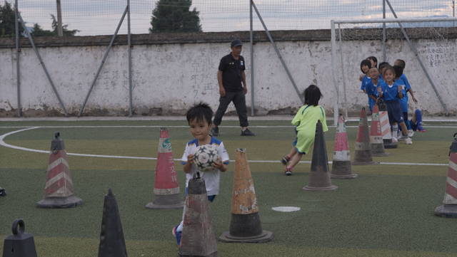 训练课上,小球场被一分为二。一到三年级的队员在小球场南侧列队做基础动作训练,身高最低的队员膝盖只略高过足球,还是费力摆动小腿盘带“巨大”的足球,跑了一圈又一圈。四到五年级的队员在小球场北侧做专项训练,动作重复枯燥,带队教练杨志坚的哨声响亮严肃,逼着队员们高度投入到每个动作里。