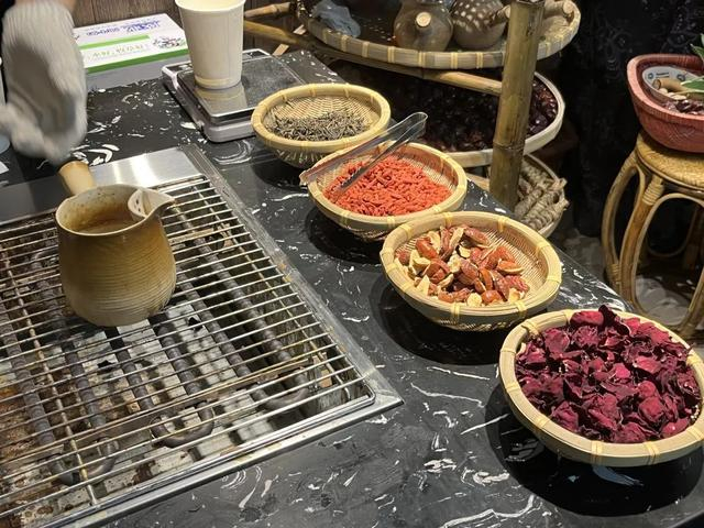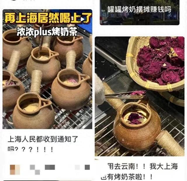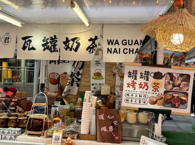 一张铁丝网上搭着四五个小陶罐,一旁摆着烤奶的原料和小料,牛奶、滇红茶叶、黄冰糖、桂花、玫瑰、茉莉、红枣、枸杞……这便是围炉煮茶的“青春版”——“罐罐烤奶”出现在各个小吃街、餐饮店的形态。