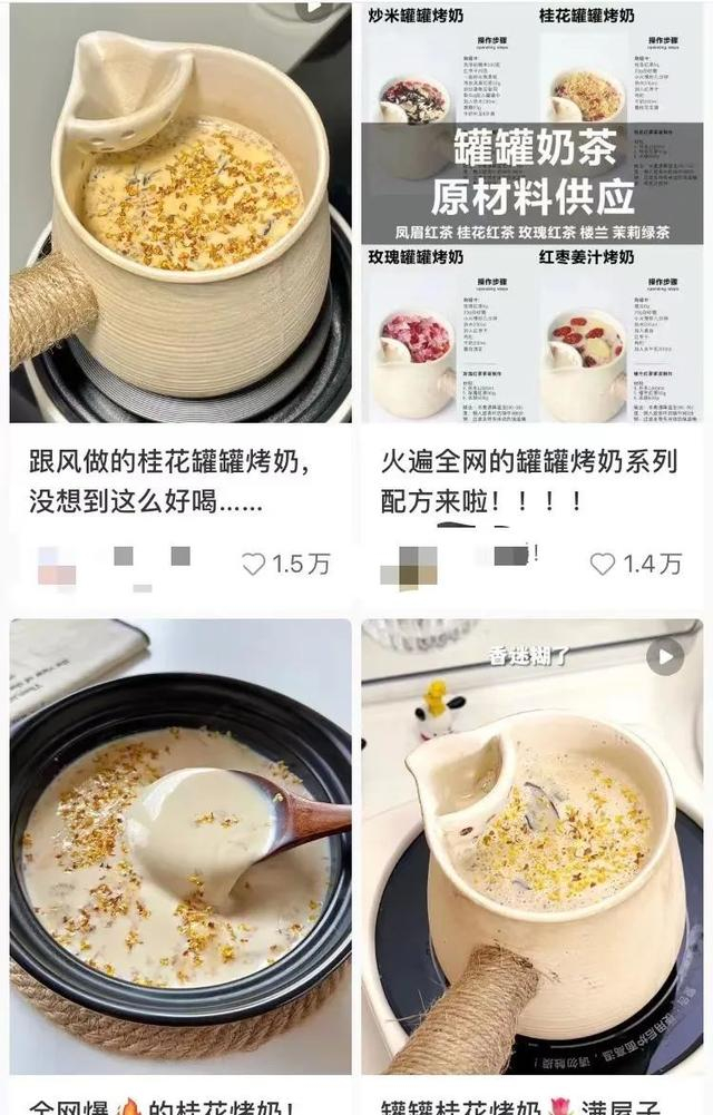 在各大社交平台上,美食博主们也纷纷推出了各类烤奶教程:“茉莉烤奶”“桂花烤奶”“红枣烤奶”“桂圆烤奶”……还有进阶版的各种“小料”搭配版,制作的食材和过程都较为简单,短短几个步骤就能做出一罐满屋飘香的秋冬热饮,和家人朋友一同享用美味的“罐罐烤奶”。