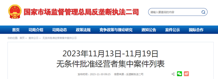 2023年11月13日-11月19日无条件批准经营者集中案件列表