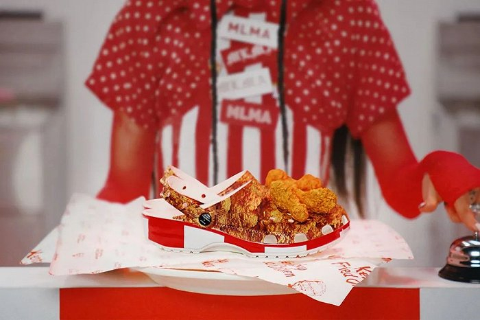 在一众肯德基自己倒腾出的日化产品线中,肯德基 x Crocs一同制作的全香型休闲鞋是一款难得的联名产品。2020年,两个知名品牌合作推出了两款限量版Crocs,一款厚底的版本登上了时装周和杂志封面,另一款经典款则限量发售,30分钟售罄。[5]