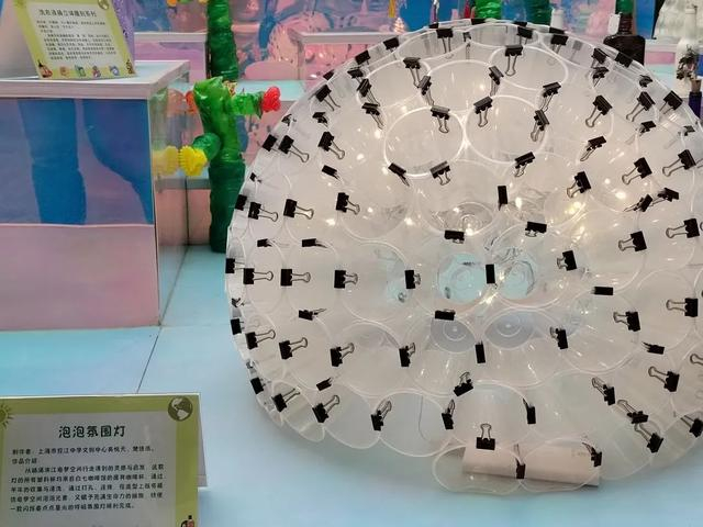 “这个泡泡氛围灯的灵感来源于杨浦滨江皂梦空间,制作这款灯所需的塑料杯,全部是学生们用半年时间收集来的废弃咖啡杯,并进行打孔、连接。”万里街道环保达人、创新屋屋主袁旻罡为学生们讲解泡泡氛围灯的创作者的故事。