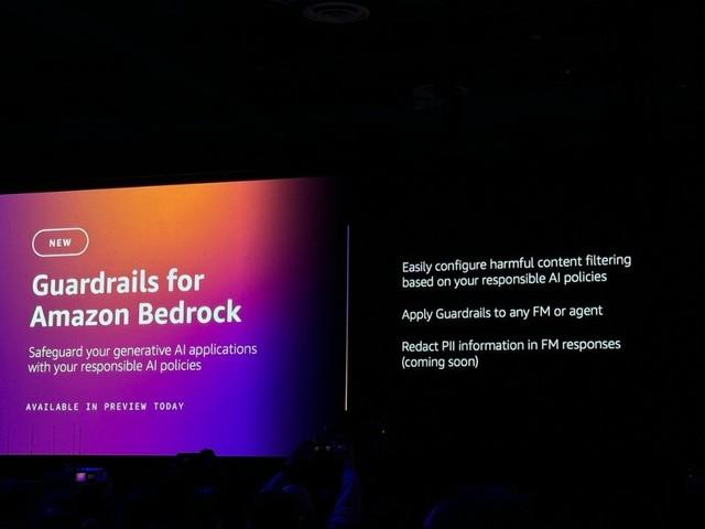 在模型工具层,Amazon Bedrock支持Stability AI、AI21 labs、Anthropic、Cohere、Meta,以及Amazon(Titan)等各类大规模语言模型或基础模型,为客户带来了更多的开放选择,已经吸引了超过1万名客户使用,这些企业通过API可以自由调用模型的各种潜力。同时,Amazon Bedrock还提供了微调、RAG和持续预训练的功能,让企业构建应用时可以获得高度的定制化能力。例如,通过微调,客户可以将模型指向Amazon S3中标记的数据示例,以提供上下文,模型会根据这些行为进行学习,找出重要信息,然后Amazon Bedrock会复制基础模型,对其进行训练,创建一个私有的精细调整模型,这样,客户就能得到定制化的结果。微调可以在Amazon Titan Text Lite和Express中使用,适用于Cohere Command Lite和Meta LLaMA 2,即将应用到Anthropic的Claude上。基于Amazon Titan大模型的预训练,则可以提高模型的知识和推理能力。此外,Agents for Amazon Bedrock的正式可用,将进一步降低客户在使用模型时的复杂度,并且结合Guardrails for Amazon Bedrock,可以根据应用程序需求和政策定制保障措施,跨基础模型,为所有应用程序提供一致的AI安全级别,阻止生成式AI应用程序中不需要的话题,根据AI策略过滤有害内容。Adam Selipsky重申:“亚马逊云科技提供的是负责任的AI。”