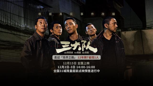 即将于12月15日上映的电影《三大队》今日发布“无尽之路”预告。预告中首次披露了三大队在12年间是如何跨越7省,在没支援没配合的情况下,用最原始的方法摸排查案的过程。在预告结尾,程兵终于找到嫌犯,无尽之路终于在第十二个年头迎来了终点。在本周末,电影《三大队》将在31城举办限量超前点映,首次与广大观众见面。电影由陈思诚监制,戴墨导演,张冀编剧,张译领衔主演,李晨特别主演,魏晨、曹炳琨、王骁、张子贤主演,杨新鸣友情出演,31城限量超前点映预售火热进行中。