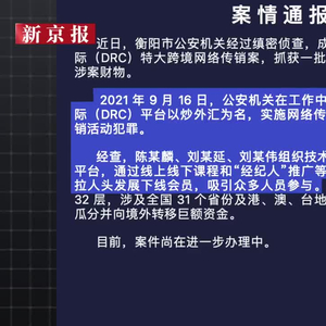【#湖南衡阳破获特大跨境网络传销案#拉人头发展下线会员32层】12月1日,湖南衡阳警方通报警方破获一起特大跨境网络传销案。2021年,警方发现刘某伟等人利用海汇国际平台以炒外汇为名,实施网络传销活动,涉嫌组织、领导传销活动犯罪,吸引众多人员参与,吸纳、瓜分并向境外转移巨额资金。近日,衡阳警方经过缜密侦查侦破公安部部督的海汇国际网络传销案,一批犯罪嫌疑人和涉案财物被抓获扣押。目前,案件尚在进一步办理中。(记者:赵露制作:高晨曦)