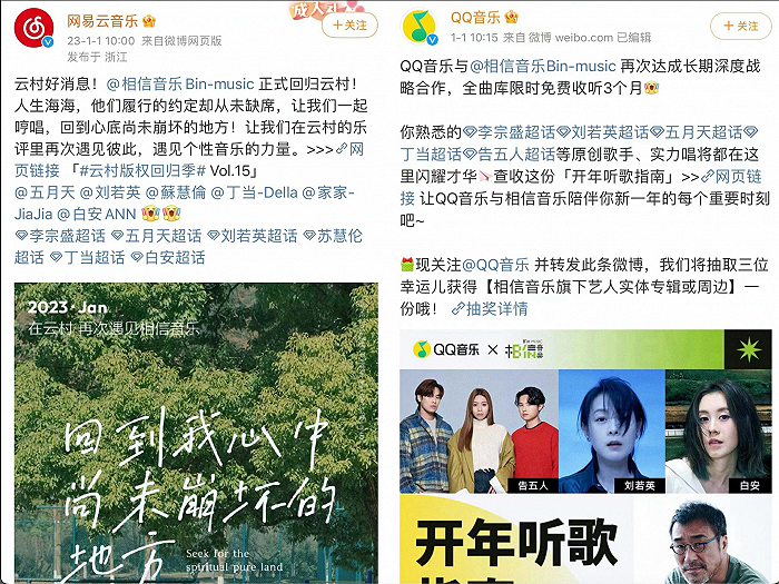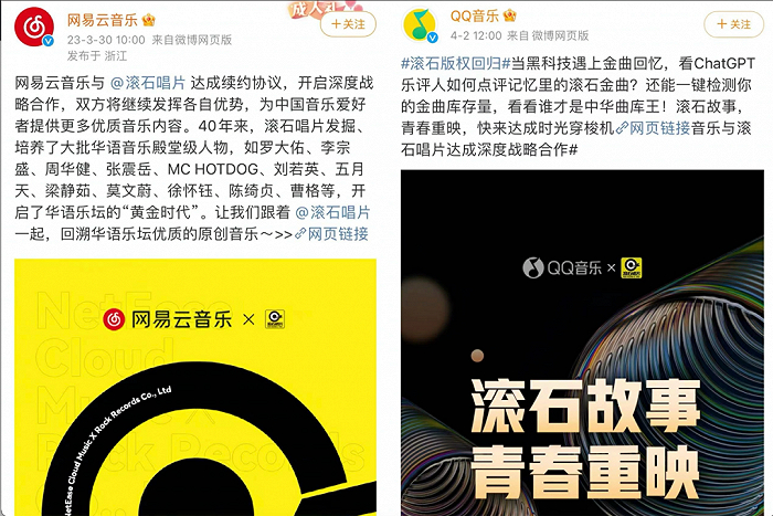 最新的一次营销“对打”是在今年4月。网易云在3月30日官宣和著名唱片公司滚石续约成功,推出了经典系列回顾内容;QQ音乐则在3天后,也上线了一个滚石唱片的“金曲回忆”内容专题。