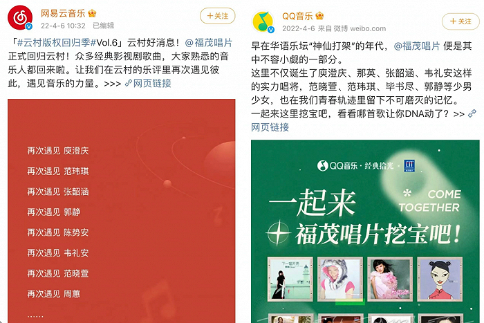 去年4月6日,拥有张韶涵、庾澄庆、范玮琪等知名艺人的福茂唱片回归网易云音乐,网易云音乐在当日上午10:32分官宣了这个消息,并推出了活动页面;3分钟后,QQ音乐发布了“一起来福茂唱片挖宝”的内容企划,唱起了对台戏。