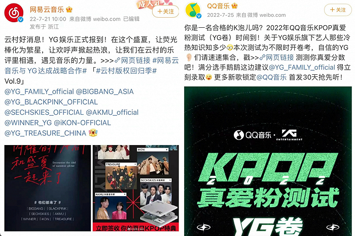 三个月后,网易云音乐于22年7月21日宣布和韩国YG娱乐达成版权合作,并策划了一期K-POP回忆杀内容;不过,这次QQ音乐方面在4天后,才上线了根据YG旗下艺人策划的真爱粉测试活动。