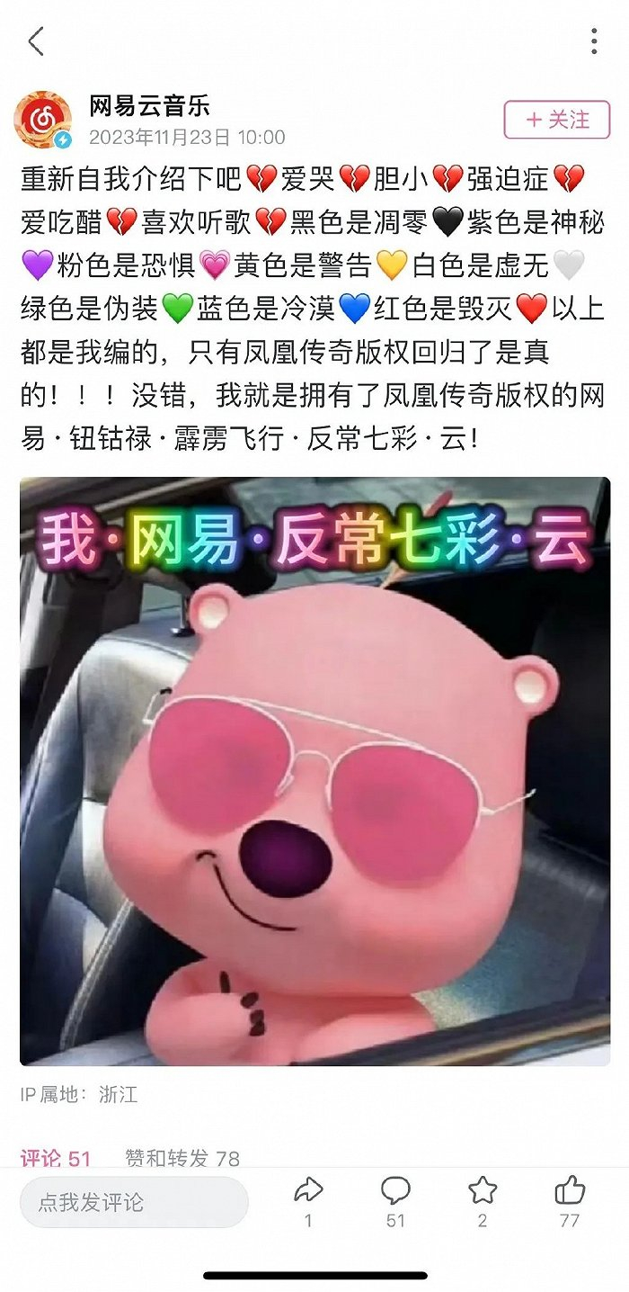 而更有趣的是他们在社交媒体上的举措。比如在年轻人最为集中的B站,网易云的官方账号先是在20号左右加上了“唯爱凤凰传奇版”的小字说明,随后更是开始在一系列“发疯”行为,比如用“反常”语气公开示爱,再比如跑到一大堆提到凤凰传奇的账号内容下面用“发疯”语录大声呼喊“买到了凤凰传奇的版权”。