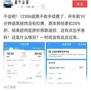 据人民网11月30日报道,近日,一则“12306退票不收手续费了,开车前10分钟退票居然没有扣费”的信息引起网友关注。对此,铁路部门进行回应。