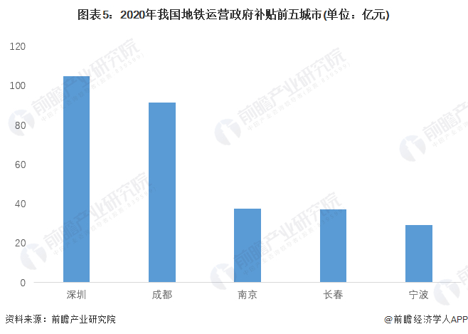 地铁票价是最主要的营收来源之一,目前,我国地铁的营收规模较低,大部分城市需要依靠政府补贴来维持正收益。据统计,深圳、成都等城市在2020年的政府补贴超过90亿元,其次,南京、长春和宁波的政府补贴也在20-40亿元之间。
