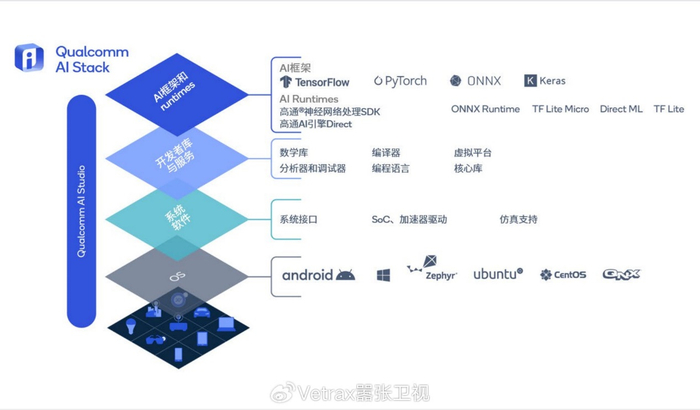 为了推动端侧AI大模型的普及与混合AI愿景的实现,高通早在去年就推出了高通AI软件栈,这是一套旨在帮助开发者一次编写、随处运行,实现规模化部署的开发工具。高通AI软件栈全面支持主流AI框架,还集成了推理软件开发包,比如高通神经网络处理SDK。支持最新编程语言、虚拟平台和编译器,在底层系统软件集成了基础的实时操作系统(RTOS)、系统接口和驱动程序,还支持广泛的操作系统,以及用于部署和监控的基础设施。高通AI软件栈还集成了开发工具高通AI Studio,支持从模型设计到优化、部署和分析的完整工作流。它将高通提供的全部工具集成到一个图形用户界面,并利用可视化工具以简化开发者体验,支持开发者实时查看模型开发进度,这其中包括高通AI模型增效工具包(AIMET)、AI模型增效工具包模型库、模型分析器和神经网络架构搜索。