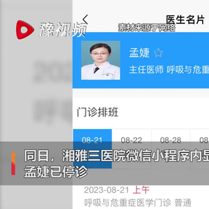 【#湘雅三医院科主任孟婕恢复门诊#】#官方称湘雅三院科主任被举报大部分不实#今年8月,中南大学湘雅三医院9名医务人员联合举报呼吸科主任孟婕“放任其无手术操作资质的学生单独进行检查,导致患者死亡”。对此,湖南省卫健委发布通报:成立联合调查组,对相关情况逐一进行核实。一经查实,将依法依规严肃处理。12月1日,湖南省卫健委一工作人员对@大河报记者表示,9名呼吸科医护人员举报反映的情况大部分不属实,医院存在一些管理不到位情况,联合调查组已对医院进行处理并要求医院进行整改。记者发现,湘雅三医院小程序预约挂号显示,孟婕已恢复预约诊号。