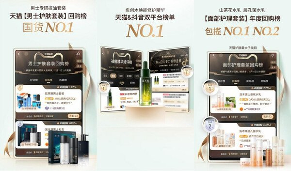 不仅如此,在细分赛道,溪木源男士斩获天猫男士护理赛道国货第一;在细分品类,其旗下大单品山茶花水乳、层孔菌水乳则包揽了天猫护肤最大子类目面部护理套装年度回购榜的前两名……