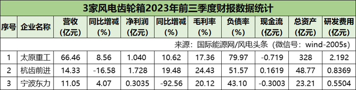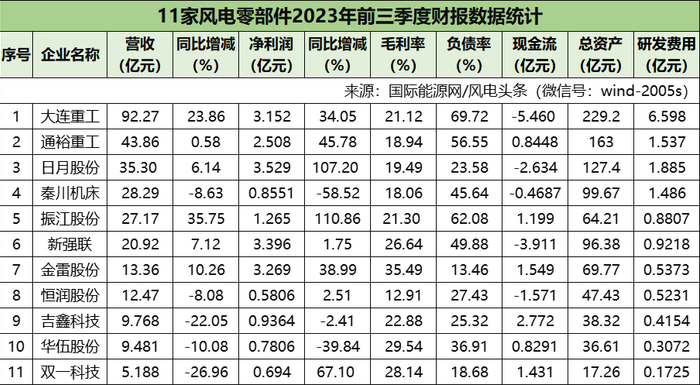 下面国际能源网/风电头条(微信号:wind-2005s)分别从营收、净利润、毛利率、负债率、现金流、总资产、研发投入等多个维度,2023年前三季度风电各产业链上市企业业绩进行分析。
