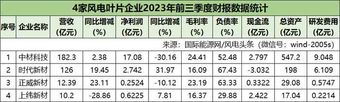 在营收方面,4家风电叶片企业营收总计330.89亿元。其中,中材科技以182.3亿元独占鳌头,时代新材以126亿元位列第二,正威新材以12.39亿元位列第三。