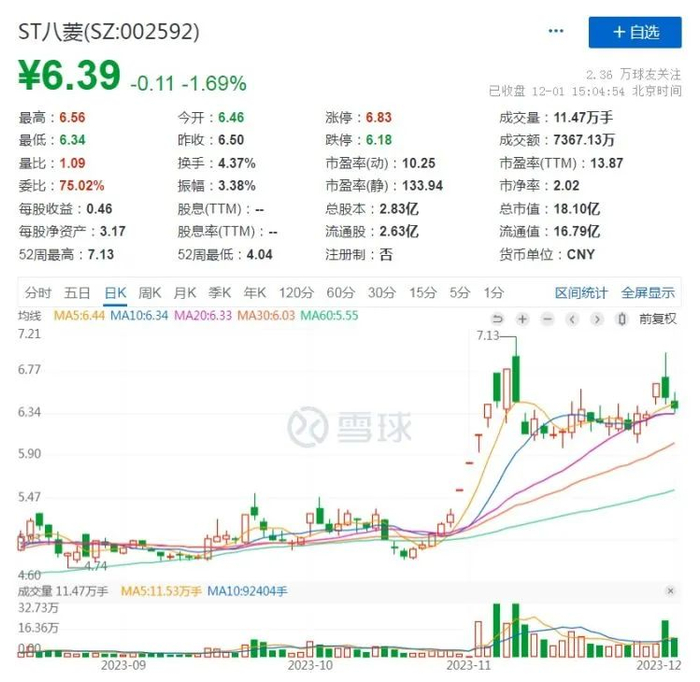 二级市场上,截至12月1日收盘,ST八菱报6.39元/股,下跌1.69%,总市值18.10亿元。