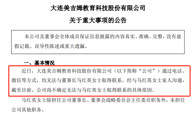 据美吉姆、*ST天山的公告,近日通过电话、微信等方式,都无法联系到董事长马红英、马长水。并且联系家属也无法得知原因。