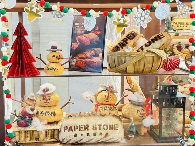 每到午间时分,附近办公楼白领纷纷出动,面包一出炉就被火速抢空,加上开业期间2件8.8折活动,工作日的晚上仍有人排队购买面包。也有不少人被门口的可爱面包造型吸引进店,纷纷掏出手机,对着雪人、麋鹿造型的面包和店内缤纷的冬日氛围感装饰拍照。