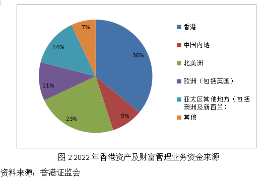 目前香港资产及财富管理业务资产按资金来源划分来看,主要以非香港资产为主,近5年来,非香港投资者的资产占比均在60%以上。截至2022年,来自非香港的资产占比为64%,其中北美洲为23%,中国内地9%,亚太区其他地方14%,欧洲11%。