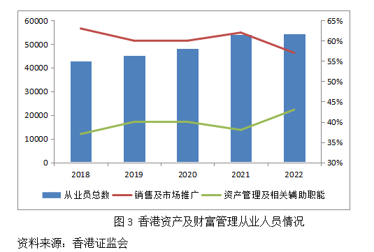 2022年,进行资产及财富管理活动人员总数为54322人,与去年基本持平,但从人员结构上来看有较大的变化,从事资产及相关辅助职能的人员占比为43%(其中风险管理/法律及合规占比6%、企业策划及商业管理占比4%、买卖/交易占比3%、研究/分析占比5%、资产管理占比8%,辅助单位占比10%、基金行政占比7%),比例同比增长5%,从事销售及市场推广的人员占比则为57%,比例同比下降5%。进一步细分资产及相关辅助职能来看,2022年同比增速最多的为企业策划及商业管理人员,同比增长26%,其次为研究/分析人员,同比增长18%。