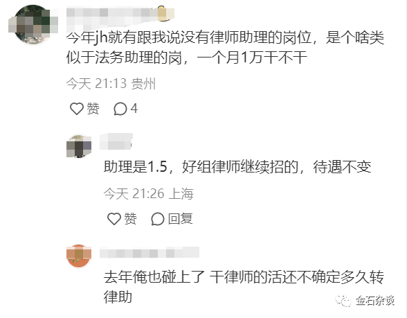 最后,咱们附两条评论吧:1)我男朋友他们所去年还能招应届3.5的律师的,今年应届就只招律师助理了,2万好像3年内都不能转律师;2)今年j开头的红圈所就有跟我说没有律师助理的岗位,是个啥类似于法务助理的岗,一个月1万干不干?