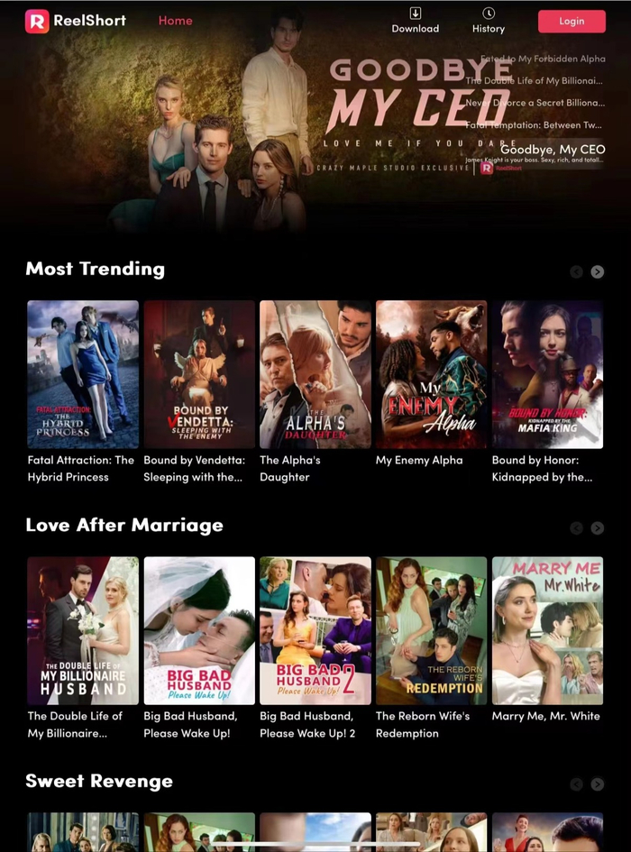目前出海赛道最火热的产品Reelshort隶属于中文在线(300364)海外子公司Crazy Maple Studio(枫叶互动),主推每集1-2分钟的超短真人剧集。打开APP首页,会发现二十余部短剧,包括先婚后爱、复仇、狼人等热门题材,大部分为原创短剧。