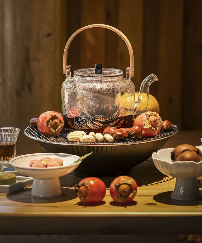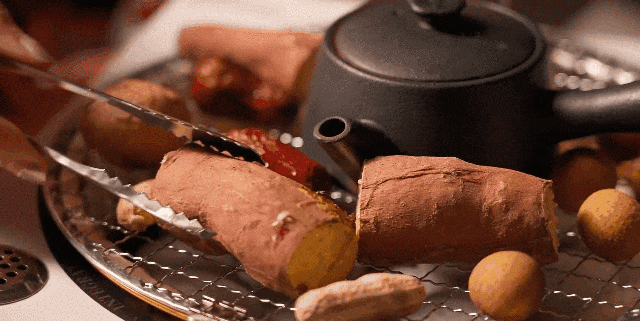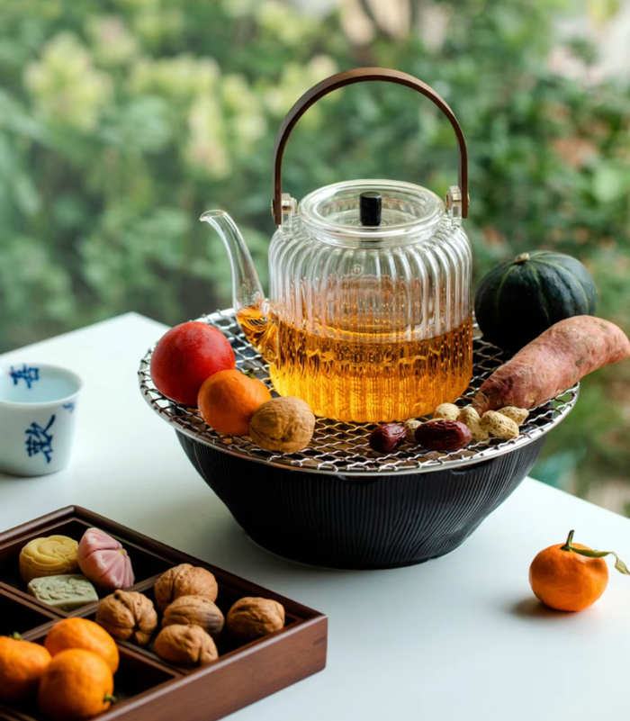 搭配赠送的烤网,一盏茶壶放中央,再烤点解馋的小零食:蜜桔、花生、栗子、年糕、红枣、甜柿还有棉花糖......想吃什么烤什么~