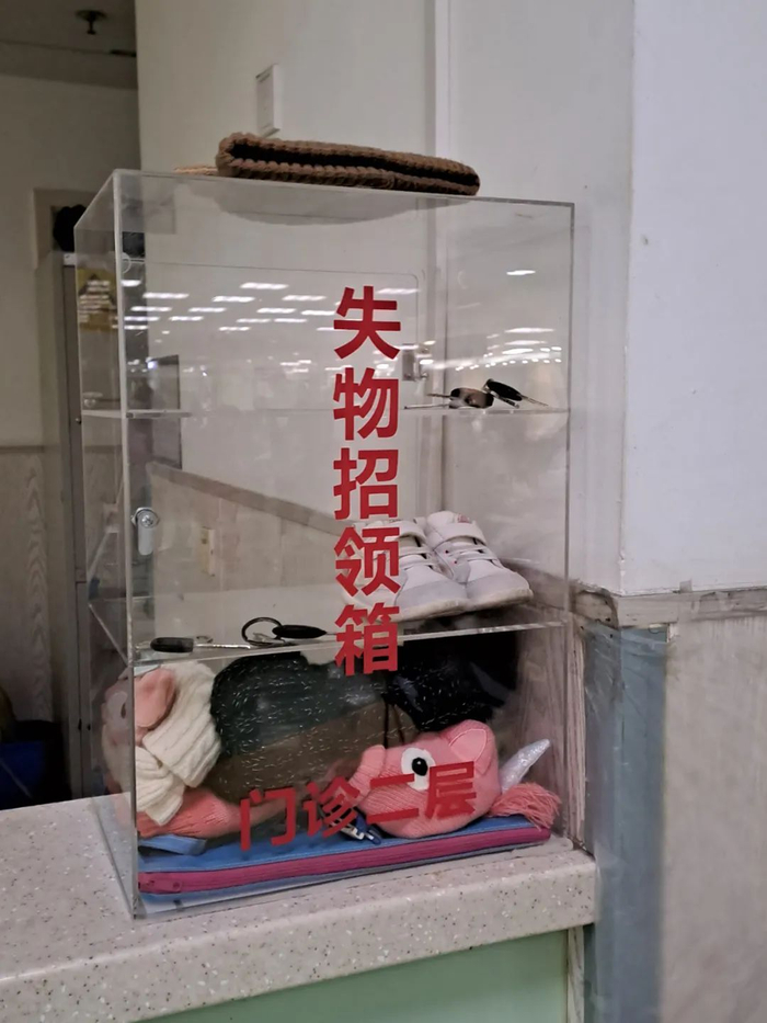门诊大楼每一层的失物招领处,都摆放着许多无人认领的物件。玩偶、耳机、一个迷彩色的保温壶,一条绿黑相间的围巾,带证件的蓝色拉链背包以及紫色帽衫。还有一个白色水杯,上面印着“GOOD DAY”。