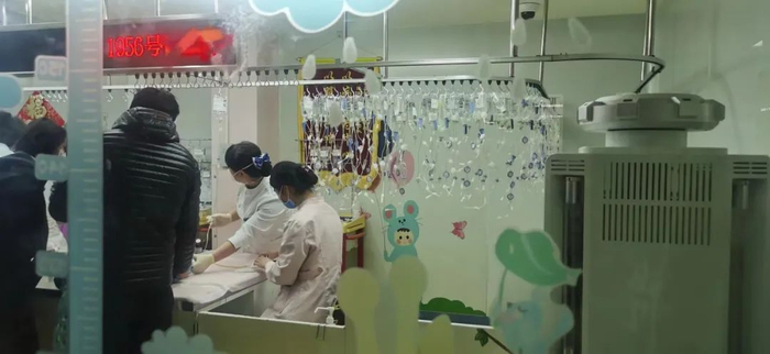 他穿过人群,带着孩子进入诊疗台,在哭喊声中,针头插入孩子手背,随后从护士手中接过输液袋,高高举过头顶,寻找座位。转个身的工夫,他不小心就会踩到别人的脚,或者撞上孩子打针的手,人群中传来家长们的慌乱声,“小心,小心,这里有人”。