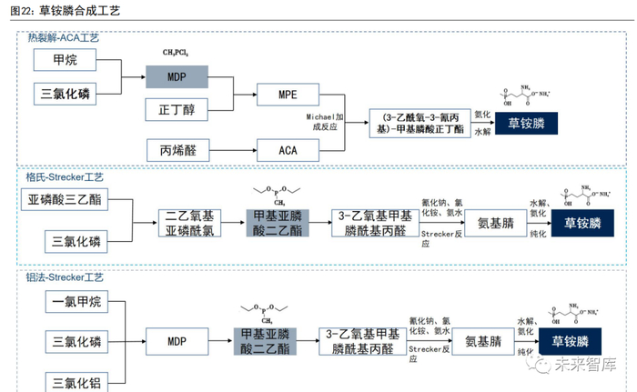 草铵膦生产工艺壁垒较高,目前全球草铵膦主要有3 种产业化生产路线:热裂解-ACA 工艺、铝法-Strecker 工艺、格氏-Strecker 工艺。理论上,草铵膦可经由化学合成法和生物发酵法提取,目前各种合成方法各有优劣,但总体都面临反应条件要求高、工艺复杂、过程控制难度大、成本较高等问题,目前国内仅有少部分公司的能实现规模化稳定生产。当前,全球草铵膦的生产工艺包括热裂解-ACA工艺、铝法-Strecker 工艺和格氏-Strecker 工艺三种,三种方法有其相似之处,但在原材料成本、过程损耗、反应机理、环保友好性和收率等方面区别较大。工艺对比:1)巴斯夫采用的热裂解-ACA 工艺比较先进,三废排放、合成成本最低,全流程可以采用连续化作业,自动化程度高,总收率可以达到95%左右;但是该工艺难度较大,对装置的要求高。2)我国大部分草铵膦生产企业采用格式-Strecker 工艺,该工艺技术壁垒低,易于产业化,但缺点是该反应需在高压下进行,易燃易爆安全隐患大,三废排放多,且收率参差不一,收率只有54%-70%;因此该工艺综合成本较高,连续化程度也不高,环保和安全水平难以企及巴斯夫路线。3)铝法-Strecker 工艺是从格式-Strecker 工艺向热裂解-ACA 工艺过渡的工艺,该工艺设备投资较小,综合成本较格式法低,但仍然存在固废产生量大、反应过程危险等问题。该法较格式法还有一个优势在于可以合成MDP,从而后段又可以改为 ACA 工艺,MDP 还可以应用于 L-高丝氨酸法合成L-草铵膦。