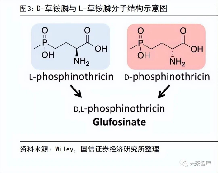 精草铵膦是草铵膦中的有效成分,可实现药效翻倍、用量减半效果。草铵膦含有一个手性中心,具有 L 型和 D 型两种光学异构体,但只有L 型具有除草活性,故L-草铵膦又称精草铵膦。目前普通草铵膦农药多为L-草铵膦和D-草铵膦按照1:1 比例组成的混合物,L-草铵膦的除草效果理论上为普通草铵膦的两倍,但是在农业实际运用过程中,L-草铵膦的除草效果约为普通草铵膦的1.8 倍,L-草铵膦的市场价格约为普通草铵膦的 1.5-1.6 倍。L-草铵膦的推广能够降低50%施药量,可有效降低使用成本,未来全面推广后全球每年可直接减排数万吨D-草铵膦无效体,有效减轻农田耕作对环境造成的负担,符合国家农药减量增效政策。