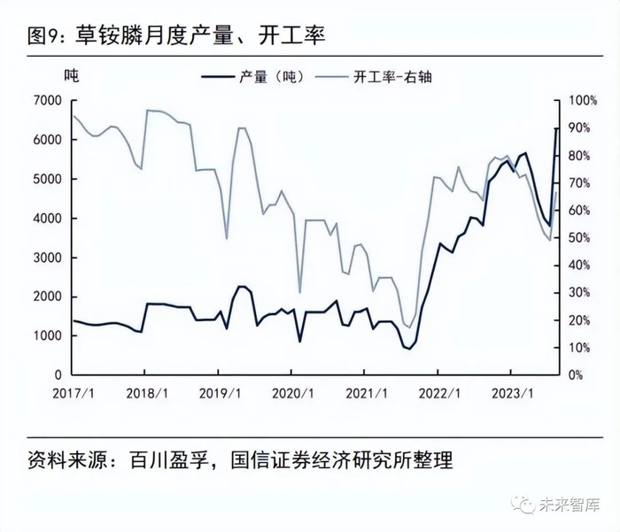 全球农化行业去库周期叠加新增产能陆续释放,草铵膦价格大幅下调,当前行业盈利微薄,部分企业已亏。受过去两年草铵膦价格大幅上涨、全球供应和物流不畅、粮食安全日益得到各国重视等多因素影响,2022 年四季度以来各市场渠道中的备货库存走高,下游去库压力提升,相对应的上游工厂库存持续走高,截至2023年 10 月初,国内草铵膦工厂库存已达 4000 吨,为自2017 年以来的最高点,预计市场中的库存消化仍将持续一段时间。在下游去库的同时,草铵膦价格一路走跌,据百川盈孚,截至 2023 年 10 月 13 日,国内草铵膦原药价格跌至6 万元/吨,而同期行业平均成本则约 6.1-6.2 万元/吨,技术相对落后的企业已经出现小幅亏损。受草铵膦价格走跌影响,今年以来国内工厂多选择降低开工负荷,7月份国内草铵膦行业开工率降至 49.03%,为 2022 年以来的最低点;8、9 月份受新增产能释放及季节性需求旺季影响,国内草铵膦行业开工率分别回升至66.37%、63.5%。总的来说,目前草铵膦仍处于供应过剩、企业竞争阶段,且新增产能还未完全释放,推涨动力不足,但考虑成本端因素,预计草铵膦价格继续下跌空间有限。与草铵膦相比,当前精草铵膦市场售价约 10.3-10.5 万元/吨,仍有2-3万元的单吨毛利润,因此从盈利角度看,开发精草铵膦也是行业的发展趋势。