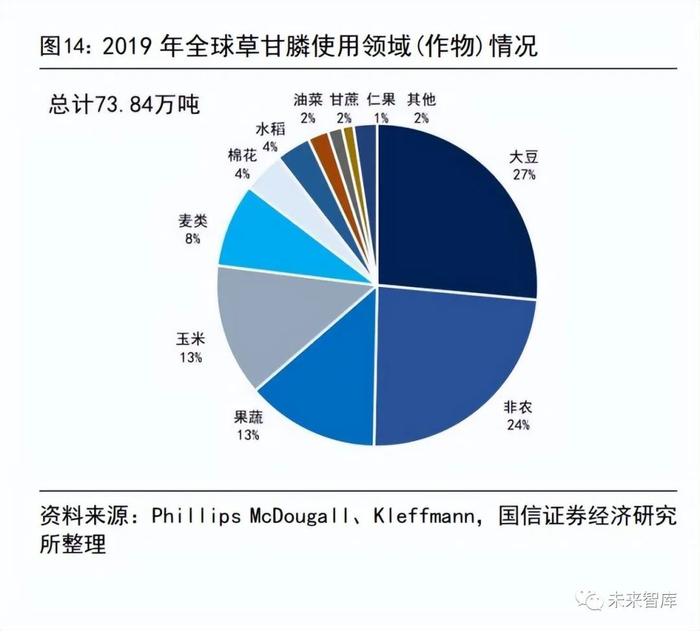 除草剂的功能和效果是决定其应用范围的主要因素,草铵膦可在部分应用场景中替代草甘膦及其他非选择性除草剂。1)从除草原理看,草铵膦内吸作用不强,通过积铵杀死根系,除根效果一般,而草甘膦通过内吸传导杀死根系,除根彻底,因此,草甘膦更适合用于大田作物除草,而草铵膦则更适合用于果蔬等领域的除草。2)从除草速度看,敌草快施药 2 小时后即可见效,草铵膦在施药后第2天即可看见变化,3-7 天后效果显著,而草甘膦需要 7-10 天见效。3)从持效期看,草铵膦的持效期在 25-40 天左右、敌草快的持效期15-20 天左右,草甘膦持效期长达 30 天以上。4)从使用场景看,敌草快比草铵膦、草甘膦更耐低温,可以在15℃以下使用,而草铵膦、草甘膦在低温下会降低除草效果。5)从适用范围看,敌草快对恶性阔叶杂草有特效,草铵膦的防治杂草的范围尤其是对于禾本科杂草比敌草快更宽,草铵膦还对小飞蓬、牛筋草等草甘膦抗性杂草有效。6)从毒性水平看,敌草快毒性较大,草铵膦、草甘膦毒性相对较小,且草铵膦比草甘膦更加低毒、安全。7)从对土壤的影响看,草铵膦在土壤中被微生物降解仅需2-6天,敌草快需要 7 天左右,而草甘膦则需要 20 天左右,而残留期直接影响到下茬作物的播种;此外,草甘膦还易于微量元素结合,使得土壤缺乏中微量元素而形成缺素症,而草铵膦、敌草快则不会出现类似情景。8)从下游用量看,据PhillipsMcDougall、Kleffmann 数据,超过 50%的草甘膦被用于大豆、玉米、麦类、水稻等大田作物的除草中,而约 45%的草铵膦被用于果蔬、油菜、葡萄等经济作物的行间除草中,同时超过 30%的草铵膦也被用于大田作物除草。总的来说,草铵膦综合除草效果优异,可以在很多场景中实现对其他除草剂的部分替代,而且随着价格下行,恢复性价比的草铵膦部分替代其他除草剂的进程有望加快。
