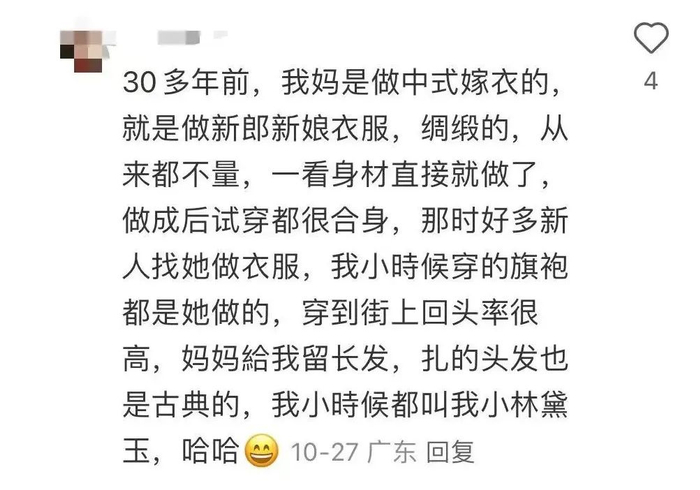 “从顺德搬回一匹上好的香云纱,回广州的菜市场师傅帮我做身结婚用的裙子,手工费才100。免去了租昂贵礼服的钱,结婚三金就这么出来了。”