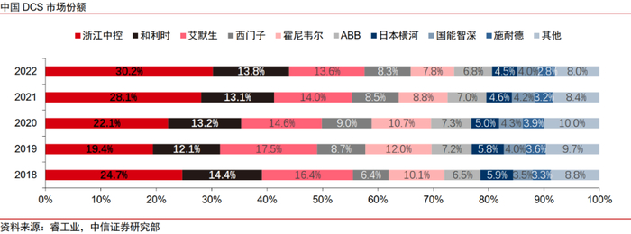 DCS是系统级方案,商业模式为咨询与实施并举,三大下游共约80%皆为流程工业,生产环境恶劣,对可靠性要求比PLC更高,根据工信部《控制系统“一条龙”应用计划申报指南》,石油石化DCS平均无故障时间要求超过22年,因此行业进入壁垒极高,强者恒强,根据睿工业数据,以合同计,中国DCS市场CR5从2011年59.9%上升至2022年73.8%。