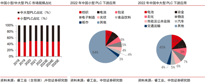PLC下游应用,PLC小型/中大型分别占比约50%,小型PLC多服务离散制造业,通过经销商卖给设备厂商;中大型PLC兼备离散与流程服务能力,直销或通过集成商服务制造企业。过去五年PLC市场空间增速较快,主要驱动因素为我国优势产业如电池、光伏等产能扩张。