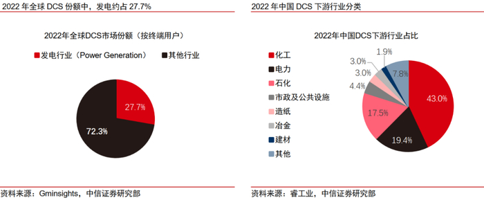 DCS下游应用,DCS下游三大行业即化工、石化、电力占比近80%,我国电力DCS市场占比相比海外较低,有提升空间。