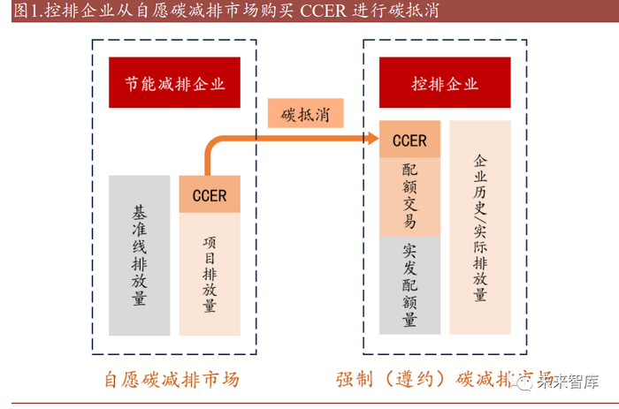 CCER 与 CEA 互为补充,提高碳配额交易活力。CCER 与碳排放配额(Carbon Emissions Allowance, “CEA”)交易同为促进企业参与减排活动、推动“双碳”目 标实现的重要手段,二者互为补充,共同构成我国完整的碳交易体系。1 个单位配 额代表持有的控排企业被允许向大气中排放 1 吨 CO₂e 的温室气体的权利,是碳 交易的主要标的物。高排放企业在初始免费配额不够的情况下,可以从其他履约 企业处购买配额,或用购买/自主开发的 CCER 项目进行部分抵消,以达到最终实 际碳排放量的抵扣,CCER 抵消碳配额比例为 1:1。