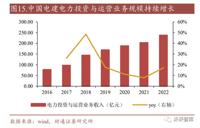 中国能建:能源电力建设龙头,聚焦新能源打造发展优势。近年来公司新能源产 业保持强劲发展劲头,风电基地开发建设提速,截至 2022 年底第一批基地已全部 开工,二三批基地项目也在陆续跟进。根据公司年报,公司装机规模快速增长, 风电、光伏已成为国内新增装机和新增发电量的主体,2022 年全年风电、光伏新 增装机 1.25 亿千瓦,占全国新增装机的 76%,新增风电、光伏的发电量占全国新 增发电量的 55%以上。从工程项目营业收入的细分行业情况来看,近年来公司新 能源工程项目的营业收入始终保持较高的增速,而从占比情况来看,传统能源营 收比重逐年下降的同时,新能源及综合智慧能源行业的营收占比呈稳健上升趋势。