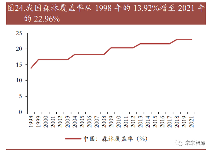 2)森林覆盖持续提升,林业碳汇未来可创造持续价值。中央定下目标,到 2030 年中国森林蓄积量比 2005 年增长 60 亿立方米,则到 2030 年,我国森林蓄积量有 望超过 184.56 亿立方米。根据《“十四五”林业草原保护发展规划纲要》提出的目 标,“到 2025 年森林覆盖率 24.1%,到 2030 年森林覆盖率 25%,未来十年造林 1881.6 万公顷”。