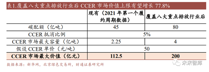 随着碳市场覆盖领域拓展,CCER 市场有望扩容至 4 亿吨/年。一般而言,由于 CCER 可申请的项目较多,因此其交易价格较碳配额通常更加便宜,控排企业会 考虑优先购买符合条件的 CCER 来抵消碳排放。根据新华社报道,按我国 2021 年 第一个履约周期的 45 亿吨碳配额为基础计算,仅有电力企业时,CCER 需求仅 2.25 亿吨/年。根据北京绿色交易所预测,未来如果碳市场向非电领域拓展,覆盖八大重点排放行业(发电、石化、化工、建材、钢铁、有色金属、造纸和国内民 用航空)后碳配额提升至 80 亿吨,CCER 需求将会上升至 4 亿吨/年,实现大幅扩 容。