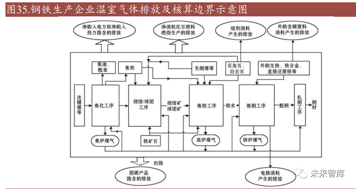 从二氧化碳排放源分类来看,《钢铁碳排放指南》将钢铁生产分为 4 个排放源:1) 燃料燃烧排放:净消耗的化石燃料燃烧产生的碳排放,包括钢铁生产企业内固定 源排放(如焦炉、烧结机、高炉、工业锅炉等固定燃烧设备),以及用于生产的移 动源排放(如运输用车辆及厂内搬运设备等);2)工业生产过程排放:钢铁生产 企业在烧结、炼铁、炼钢等工序中由于其他外购含碳原料(如电极、生铁、铁合 金、直接还原铁等)和熔剂的分解和氧化产生的碳排放;3)净购入使用的电力、 热力产生的排放:企业净购入电力和净购入热力(如蒸汽)隐含产生的碳排放; 4)固碳产品隐含的排放:钢铁生产过程中有少部分碳固化在企业生产的生铁粗钢 等外销产品中,还有一小部分碳固化在以副产煤气为原料生产的甲醇等固碳产品 中,这部分固化在产品中的碳所对应的二氧化碳排放应予扣除。