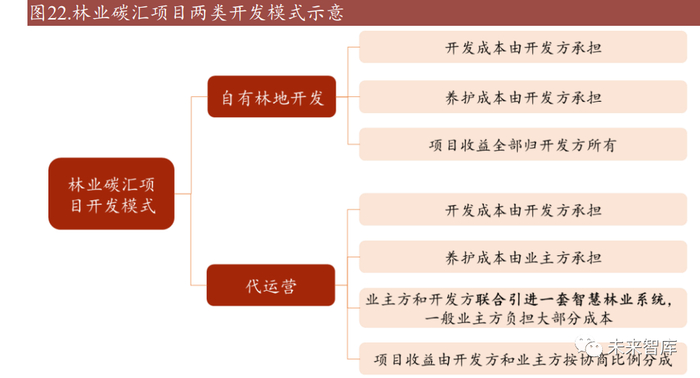 在此基础上,林业碳汇项目开发以代运营模式为主,不断提升项目专业性。林业 碳汇项目开发可分为自有林地开发与代运营两类,其中自有林地需要开发方自己 负担林地的养护成本,而代运营林地的常规养护成本则由业主方完全承担。一般 情况下,项目注册备案完成后,业主方和项目开发方将会联合引进一套智慧林业系统,在项目运营周期中,起到防火、防盗、防病虫等危害的作用。由于林业碳 汇项目开发在指标测量、方法学的选择和第三方核证过程中涉及多项要求,具有 一定难度,因此专业的代运营项目方能够更好地与核证机构、审批机构进行有效 沟通,提高项目申请的成功率,代运营模式逐渐成为市场主流。
