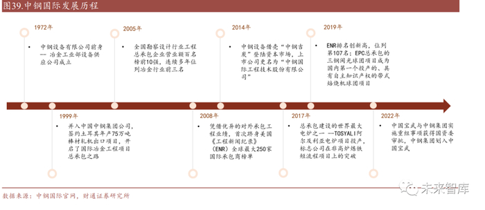 冶金工程龙头中钢国际,绿色低碳工艺领跑行业。公司是国内率先以 EPC 模式承 接海外项目的工程技术服务商,打造全球首例氢能源冶金示范项目。中钢国际立 足冶金全流程 EPC 总承包能力,聚焦“绿色制造、制造绿色”工程技术,围绕氢 冶金、富氢碳循环高炉、电炉、薄带铸轧、长材高效高精度轧制技术及装备、冷 轧及后续处理线等低碳冶金技术,为客户提供全流程、绿色系统解决方案。2022 年中钢集团整体划入中国宝武,进一步赋能中钢国际的低碳冶金业务。