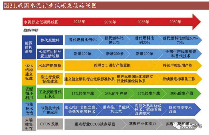 对于水泥企业,当前市场上常见的减碳的方式有:1)调整能源结构:减少煤电占 比,增加绿色能源、可替代能源的使用比例;2)产能置换:采用低碳高效的新型 产能对老旧产能实现置换;3)资源循环利用:采用废渣中的非碳酸盐原料代替石 灰石原料;4)节能技术改造:采用节能立磨技术、高能效熟料烧成技术、能效管 理技术等等助力水泥行业碳减排;5)末端捕集封存:CCUS 碳捕捉、利用与封存 是国际公认三大减碳途径之一,我国在此技术上的产业化能力仍有待提升。