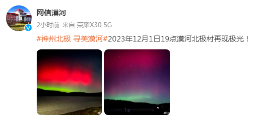 在本次地磁暴的作用下,12月1日晚,黑龙江漠河北极村出现红绿极光。