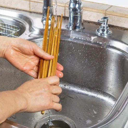 养成饭后立即清洗筷子的习惯,在柔软的洗碗布上滴些洗洁精,一根根搓洗,既减少了摩擦,也能洗得更干净。蘸了洗洁精的筷子,应用流动的清水逐根冲洗,千万不要整把在水里搓。
