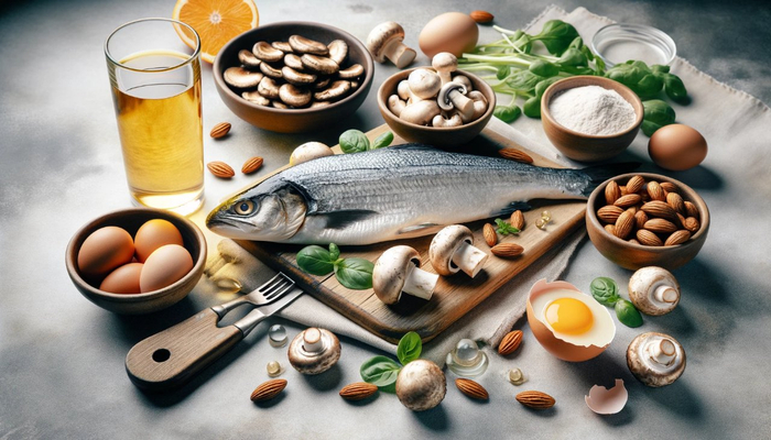 食物中富含维生素D的有油性鱼类(如鲑鱼、鲭鱼和鳕鱼)、蛋黄、牛奶及其衍生品、某些蘑菇品种以及强化食品(如强化牛奶和橙汁)。