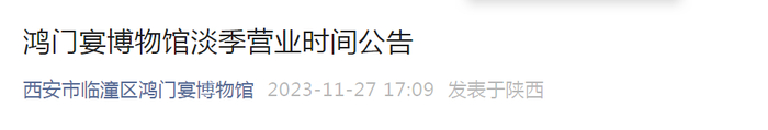 2、从2023年12月1日起至2024年2月底,鸿门宴博物馆运营时间调整为:上午9:00--下午17:00。